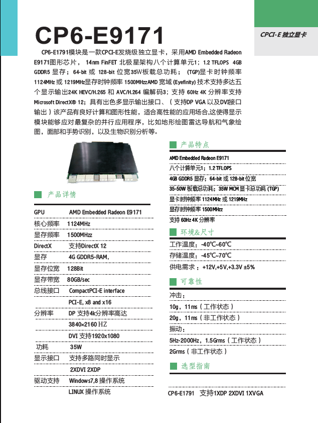 CP6-E1791模塊是一款CPCI-E發(fā)燒級獨(dú)立顯卡,采用AMD Embedded Radeon